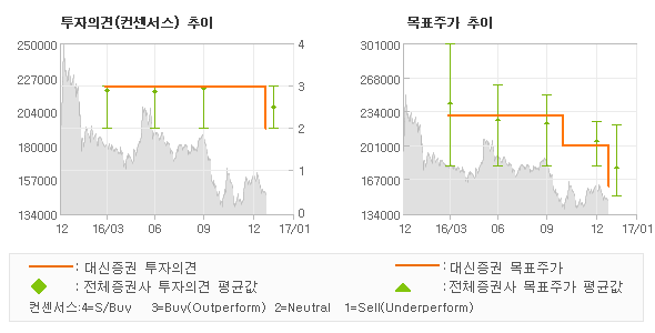 대신증권의 동종목에 대한 최근 1년동안의 투자의견은 전체적으로 조금 하향조정되고 있다. 목표주가는 2016년3월 230,000원까지 높아졌다가 2016년10월 200,000원을 최저점으로 목표가가 제시된 이후 최근에 160,000원으로 새롭게 조정되고 있다.