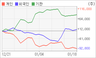 | 외국인/기관 순매수, 개인은 순매도(한달누적) 1월16일부터 전일까지 기관이 3거래일 연속 순매수했다. 4주간을 기준으로 보면 외국인이 매매관점을 매도에서 매수로 전환하면서 7,187주를 순매수했고, 기관도 초반에 동종목을 순매수한 이후에 최근에는 순매수량이 줄어들고 있음에도 불구하고 85,538주를 순매수했다. 반면 개인들은 매도쪽으로 방향을 잡으면서 92,725주를 순매도한 것으로 나타났다. |