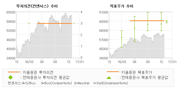 오늘 키움증권에서 발표된 '매수(유지)'의견 및 목표주가 80,000원은 전체의견에 수렴하면서 시장의 평균적인 기대감이 비교적 객관적으로 표현된 것으로 풀이되며 목표가평균 대비 3.5% 초과하고 있는 것으로 집계되었다. 참고로 최근에 목표주가를 가장 공격적으로 제시한 KB증권에서 투자의견 '매수(유지)'에 목표주가 90,000원을 제일 보수적인 의견을 제시한 SK증권에서 투자의견 '매수(유지)'에 목표주가 67,000원을 제시한 바 있다.