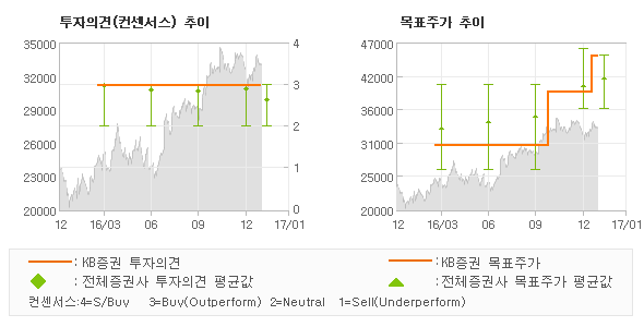 KB증권의 동종목에 대한 최근 1년동안의 투자의견은 전체적으로 큰 변화없이 유지되고 있다. 목표주가는 2016년3월 30,000원이 저점으로 제시된 이후 이번에 발표된 45,000원까지 꾸준하게 상향조정되어 왔다.