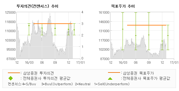 오늘 삼성증권에서 발표된 '매수'의견 및 목표주가 140,000원은 전체 컨센서스 대비해서 상대적으로 긍정적인 수준으로서 이는 동종목에 대한 기대감을 보다 강하게 표현한 것으로 풀이되며 목표가평균 대비 23.4% 초과하고 있는 것으로 집계되었다. 참고로 최근에 목표주가를 가장 공격적으로 제시한 유안타증권에서 투자의견 '매수(유지)'에 목표주가 140,000원을 제일 보수적인 의견을 제시한 KTB투자증권에서 투자의견 'HOLD'에 목표주가 100,000원을 제시한 바 있다.
