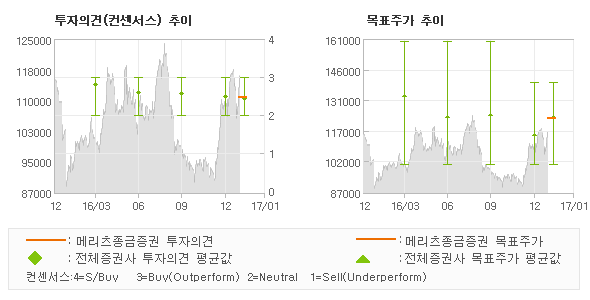 오늘 메리츠종금증권에서 발표된 'TRADING BUY'의견 및 목표주가 123,000원은 전체 컨센서스 대비해서 대체적으로 평균치에 해당하는 수준으로, 이번 의견은 동종목에 대한 전체적인 흐름에서 크게 벗어나지 않은 것으로 파악되며 목표가평균 대비 7.8% 초과하고 있는 것으로 집계되었다. 참고로 최근에 목표주가를 가장 공격적으로 제시한 유안타증권에서 투자의견 '매수(유지)'에 목표주가 140,000원을 제일 보수적인 의견을 제시한 KTB투자증권에서 투자의견 'HOLD'에 목표주가 100,000원을 제시한 바 있다.