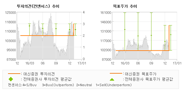 오늘 대신증권에서 발표된 '매수(상향)'의견 및 목표주가 140,000원은 전체 컨센서스 대비해서 상대적으로 긍정적인 수준으로서 이는 동종목에 대한 기대감을 보다 강하게 표현한 것으로 풀이되며 목표가평균 대비 20.1% 초과하고 있는 것으로 집계되었다. 참고로 최근에 목표주가를 가장 공격적으로 제시한 유안타증권에서 투자의견 '매수(유지)'에 목표주가 140,000원을 제일 보수적인 의견을 제시한 KTB투자증권에서 투자의견 'HOLD'에 목표주가 100,000원을 제시한 바 있다.
