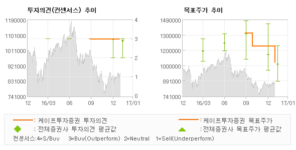 케이프투자증권의 동종목에 대한 최근 3개월 동안의 투자의견은 전체적으로 큰 변화없이 유지되고 있다. 목표주가는 2016년9월 1,360,000원까지 높아졌다가 2016년10월 1,230,000원을 최저점으로 목표가가 제시된 이후 최근에 1,070,000원으로 새롭게 조정되고 있다.