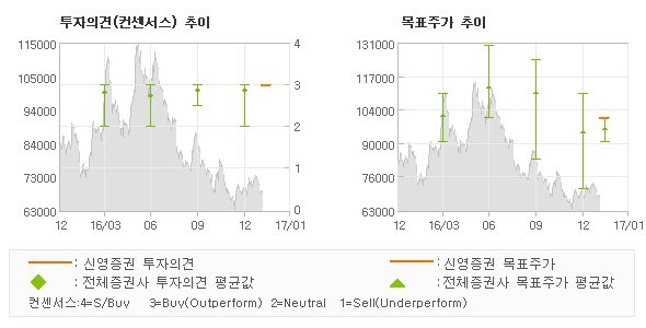 오늘 신영증권에서 발표된 '매수(신규)'의견 및 목표주가 100,000원은 전체의견에 수렴하면서 시장의 평균적인 기대감이 비교적 객관적으로 표현된 것으로 풀이되며 목표가평균 대비 5.3% 초과하고 있는 것으로 집계되었다. 참고로 최근 증권사 매매의견 중에서 제일 보수적인 의견을 제시한 NH투자증권에서 투자의견 '매수(유지)'에 목표주가 90,000원을 제시한 바 있다.