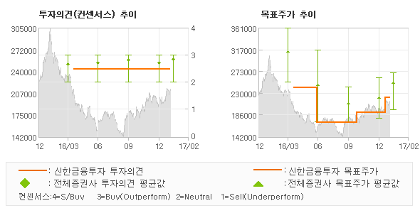 신한금융투자의 동종목에 대한 최근 9개월 동안의 투자의견은 전체적으로 조금 하향조정되고 있다. 목표주가는 2016년4월 240,000원까지 높아졌다가 2016년6월 170,000원을 최저점으로 목표가가 제시된 이후 최근에 220,000원으로 새롭게 조정되고 있다.