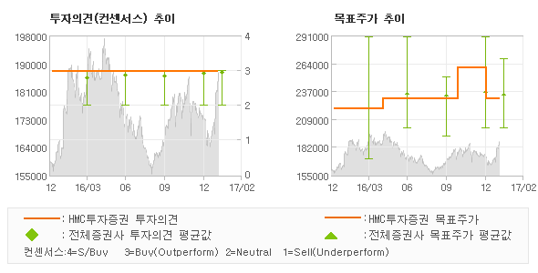 HMC투자증권의 동종목에 대한 최근 1년동안의 투자의견은 전체적으로 큰 변화없이 유지되고 있다. 목표주가는 2016년1월 220,000원이 저점으로 제시된 이후 2016년10월 260,000원을 최고점으로 목표가가 제시되었고 최근에는 230,000원으로 다소 하향조정되고 있다.