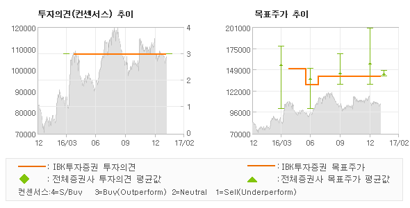 IBK투자증권의 동종목에 대한 최근 9개월 동안의 투자의견은 전체적으로 큰 변화없이 유지되고 있다. 목표주가는 2016년4월 150,000원까지 높아졌다가 2016년6월 130,000원을 최저점으로 목표가가 제시된 이후 최근에 140,000원으로 새롭게 조정되고 있다.
