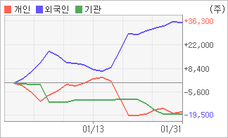| 기관과 개인은 순매도, 외국인은 순매수(한달누적) 1월26일부터 전일까지 기관이 2거래일 연속 순매수했다. 4주간을 기준으로 보면 외국인이 초반에 동종목을 순매수한 이후에 기세를 이어가며 35,515주를 순매수한 반면, 기관은 매도 관점으로 접근하면서 18,287주를 순매도했고, 개인들도 매도 우위로 반전되면서 17,228주를 순매도한 것으로 집계됐다. |