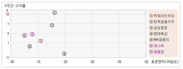 | 업종평균과 비교해서 변동폭 대비 성과 좋지 않아 1일 오후 12시5분 현재 전일대비 1.74% 오른 8,200원을 기록하고 있는 맥쿼리인프라는 지난 1개월간 0.61% 상승했다. 동기간 동안에 주가의 변동성 지표인 표준편차는 1.1%를 기록했다. 이는 금융업 업종내에서 주요종목들과 비교해볼 때 맥쿼리인프라의 월간 주가수익률은 적정한 수준에 있었지만 변동성은 상대적으로 낮은 수준을 유지했다는 뜻이다. 최근 1개월을 기준으로 맥쿼리인프라의 위험을 고려한 수익률은 0.5를 기록했는데, 변동성은 낮은 편이었지만 주가상승률 또한 높지 않았기 때문에 전체적인 관점에서의 위험대비 수익률은 중간 수준을 유지했다. 다만 금융업업종의 위험대비수익률 4.2보다는 낮았기 때문에 업종대비 성과는 긍정적으로 보기 어렵다. 다음으로 업종과 시장을 비교해보면 맥쿼리인프라가 속해 있는 금융업업종은 코스피지수보다 변동성과 수익률이 모두 높은 모습이다. 다시 말하면 동업종에 탄력이 붙으면서 지수대비 초과상승했다는 의미이다. |