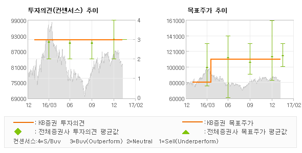 KB증권의 동종목에 대한 최근 1년동안의 투자의견은 전체적으로 큰 변화없이 유지되고 있다. 목표주가는 2016년1월 80,000원이 저점으로 제시된 이후 이번에 발표된 110,000원까지 꾸준하게 상향조정되어 왔다.