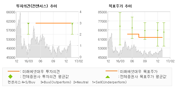 미래에셋대우의 동종목에 대한 최근 9개월 동안의 투자의견은 전체적으로 큰 변화없이 유지되고 있다. 목표주가는 2016년5월 64,800원까지 높아졌다가 2016년8월 62,000원을 최저점으로 목표가가 제시된 이후 최근에도 62,000원으로 제시되고 있다.