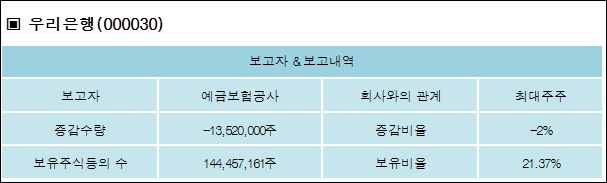 우리은행(000030)은 03일 최대주주 예금보험공사의 보유주식이 감소되었다고 발표했다. 이는 직전 보고일보다 13,520,000주 감소하여 지분율은 21.37%로 하락했다. 이번 보고 사유는 예금보험공사보유지분변동상황보고로 알려졌다.