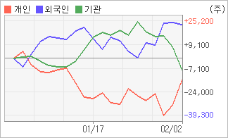 | 기관과 개인은 순매도, 외국인은 순매수(한달누적) 2월1일부터 전일까지 기관이 2거래일 연속 순매도를 보였다. 4주간을 기준으로 보면 외국인이 초반에 동종목을 순매수한 이후에 기세를 이어가며 22,823주를 순매수한 반면, 기관은 순매수에서 순매도로 반전되면서 7,807주를 순매도했고, 개인들도 초반에 동종목을 순매도한 이후에 근래에는 순매도량을 줄이면서 15,016주를 순매도한 것으로 집계됐다. |