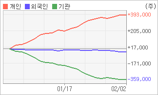 | 외국인과 기관은 순매도, 개인은 순매수(한달누적) 1월31일부터 전일까지 기관이 3거래일 연속 순매도를 보였다. 4주간을 기준으로 보면 외국인이 매도 우위를 지속하면서 34,058주를 순매도했고, 기관도 매도 관점으로 접근하면서 358,849주를 순매도했지만, 개인은 오히려 순매수량을 늘리며 392,907주를 순매수했다. |