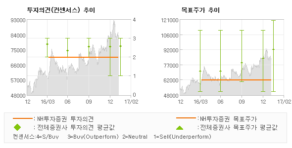 오늘 NH투자증권에서 발표된 'HOLD(유지)'의견 및 목표주가 62,000원은 전체 컨센서스 대비해서 소폭 낮은 수준으로서 다소 보수적으로 표현된 것으로 풀이되며 목표가평균 대비 31%정도 미달하고 있는 것으로 집계되었다. 참고로 최근에 목표주가를 가장 공격적으로 제시한 HMC투자증권에서 투자의견 '매수'에 목표주가 120,000원을 제일 보수적인 의견을 제시한 KTB투자증권에서 투자의견 'REDUCE'에 목표주가 50,000원을 제시한 바 있다.