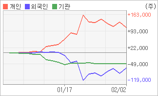 | 외국인과 기관은 순매도, 개인은 순매수(한달누적) 전일 외국인이 22,956주를 순매수했다. 4주간을 기준으로 보면 외국인이 매도 우위를 지속하면서 64,795주를 순매도했고, 기관도 매도 관점으로 접근하면서 45,517주를 순매도했지만, 개인은 오히려 순매수량을 늘리며 110,312주를 순매수했다. |