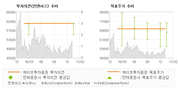 오늘 케이프투자증권에서 발표된 '매수(유지)'의견 및 목표주가 70,000원은 전체의견에 수렴하면서 시장의 평균적인 기대감이 비교적 객관적으로 표현된 것으로 풀이되며 목표가평균 대비 5.5% 초과하고 있는 것으로 집계되었다. 참고로 최근에 목표주가를 가장 공격적으로 제시한 KB증권에서 투자의견 '매수(유지)'에 목표주가 75,000원을 제일 보수적인 의견을 제시한 하나금융투자에서 투자의견 'NEUTRAL'에 목표주가 54,000원을 제시한 바 있다.