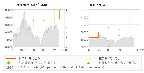 SK증권의 동종목에 대한 최근 1년동안의 투자의견은 전체적으로 큰 변화없이 유지되고 있다. 목표주가는 2016년1월 85,000원이 저점으로 제시된 이후 이번에 발표된 100,000원까지 꾸준하게 상향조정되어 왔다.