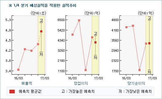 씽크풀 리서치센터가 집계한 마켓 컨센서스에 따르면 이번분기 예상실적 범위는 매출액 4조1860억원 ~ 4조7570억원, 영업이익 3,100억원 ~ 5,480억원, 당기순이익 2,870억원 ~ 4,230억원으로 각각 집계되었는데, SK증권의 추정치는 특히 컨센서스(평균)대비 당기순이익을 -46.82% 낮게 예상하고 있어서 향후 수익성 전망이 시장의견보다 보수적인 것으로 평가된다.