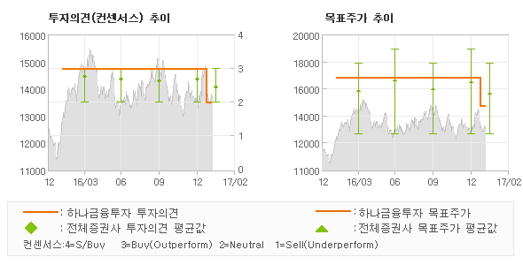 하나금융투자의 동종목에 대한 최근 1년동안의 투자의견은 전체적으로 조금 하향조정되고 있다. 목표주가는 2016년2월 17,000원까지 높아졌다가 2017년1월 15,000원을 최저점으로 목표가가 제시된 이후 최근에도 15,000원으로 제시되고 있다.