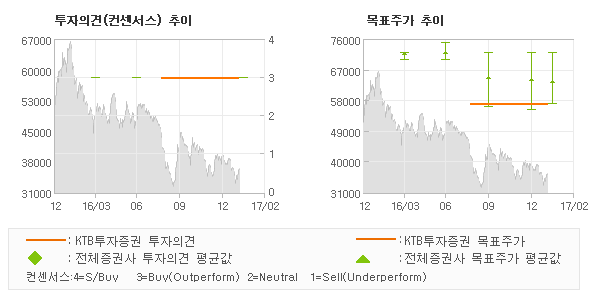 오늘 KTB투자증권에서 발표된 '매수'의견 및 목표주가 57,000원은 전체의견에 수렴하면서 시장의 평균적인 기대감이 비교적 객관적으로 표현된 것으로 풀이되며 목표가평균 대비 11.7%정도 미달하고 있는 것으로 집계되었다. 참고로 최근에 목표주가를 가장 공격적으로 제시한 유진투자증권에서 투자의견 '매수(유지)'에 목표주가 72,100원을 제시한 바 있다.