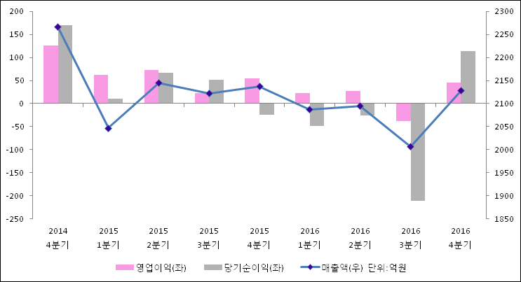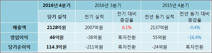 02월 03일 흥아해운(003280)의 2016년 4분기 연결 잠정_대량변동 실적이 발표됐다. 지난해 같은 기간 대비해서 매출액은 0.4% 하락하여 2128억원을 기록했다. 영업이익은 16.4% 감소하여 46억원라고 발표됐다. 당기순이익은 -24억원에서114.3억원으로 흑자전환되었다.