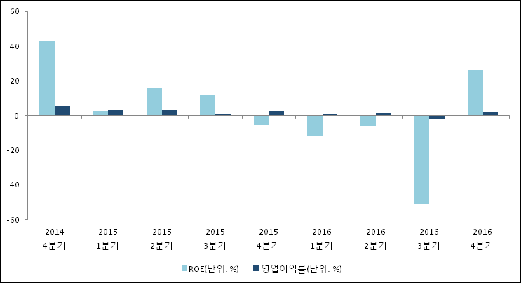 이번분기 기준으로 추정되는 흥아해운의 자기자본이익률(ROE)은 26.3%로 나타났다. 이는 최근 일년과 비교했을 때 급등한 수치이다. 4분기 자기자본은 상승하였으나 당기순이익 상승폭이 더 컸기 때문이다. 전년 동기인 2015년 4분기 ROE는 -5.5%로 이번 분기에 31.8%p 상승했다. 한편 동종목의영업이익률은 2.2%이다. 지난해 동기 영업이익률은 2.6%로 이번 4분기에 0.4%p 하락했다.