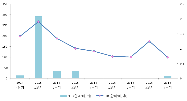 주가가 1주당 순자산의 몇배인지 알려주는 주가순자산비율인 PBR은 0.71배이다. 지난해 동기 PBR은 0.91배로 이번 4분기 PBR이 하락했다.