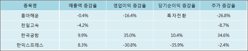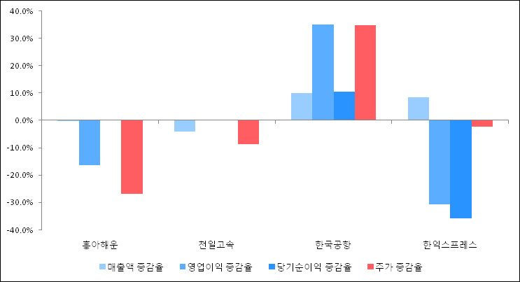 다음은 흥아해운과 동일 업종 내 비교 그룹 종목의 각각 최근 실적의 전년 동기 대비 성장률이다. 흥아해운의 매출액 증감율은 타 종목 대비 저조한 편이다. 그리고 주가의 하락율이 가장 큰 편으로 나타났다.