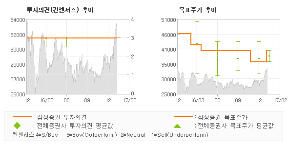 삼성증권의 동종목에 대한 최근 1년동안의 투자의견은 전체적으로 큰 변화없이 유지되고 있다. 목표주가는 2016년1월 46,000원까지 높아졌다가 2016년11월 36,000원을 최저점으로 목표가가 제시된 이후 최근에 40,000원으로 새롭게 조정되고 있다.