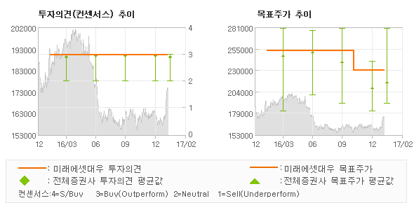 미래에셋대우의 동종목에 대한 최근 1년동안의 투자의견은 전체적으로 큰 변화없이 유지되고 있다. 목표주가는 2016년2월 254,000원까지 높아졌다가 2016년11월 230,000원을 최저점으로 목표가가 제시된 이후 최근에도 230,000원으로 제시되고 있다.