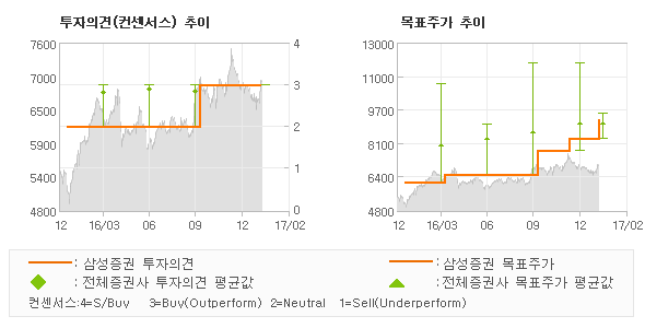 오늘 삼성증권에서 발표된 '매수'의견 및 목표주가 9,200원은 전체 컨센서스 대비해서 대체적으로 평균치에 해당하는 수준으로, 이번 의견은 동종목에 대한 전체적인 흐름에서 크게 벗어나지 않은 것으로 파악되며 목표가평균과 대비해서 미미한 차이가 나는 것으로 집계되었다. 참고로 최근에 목표주가를 가장 공격적으로 제시한 신한금융투자에서 투자의견 '매수(유지)'에 목표주가 9,500원을 제일 보수적인 의견을 제시한 하이투자증권에서 투자의견 '매수(유지)'에 목표주가 9,000원을 제시한 바 있다.