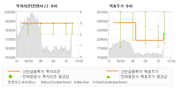 신한금융투자의 동종목에 대한 최근 1년동안의 투자의견은 전체적으로 큰 변화없이 유지되고 있다. 목표주가는 2016년2월 250,000원까지 높아졌다가 2016년7월 200,000원을 최저점으로 목표가가 제시된 이후 최근에 220,000원으로 새롭게 조정되고 있다.