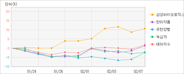 전체적인 평가에서는 삼성바이오로직스가 높은 순위를 차지했다. 최근 10거래일(2주)을 분석했을때, 삼성바이오로직스(10.63%)의 상승률이 상대적으로 큰 것으로 나타났다. 위험도 분석에서는 삼성바이오로직스(0.82), 한미약품(0.54)이 상대적으로 안정적인 수익을 올린 것으로 평가되고 변동성 대비 등락률을 구해보면 삼성바이오로직스(4.82)가 좋은 모습을 보였다.