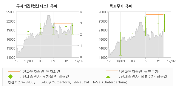 오늘 한화투자증권에서 발표된 '매수(유지)'의견 및 목표주가 27,000원은 전체의견에 수렴하면서 시장의 평균적인 기대감이 비교적 객관적으로 표현된 것으로 풀이되며 목표가평균 대비 15.2% 초과하고 있는 것으로 집계되었다. 참고로 최근 증권사 매매의견 중에서 제일 보수적인 의견을 제시한 신한금융투자에서 투자의견 'TRADING BUY(유지)'에 목표주가 20,000원을 제시한 바 있다.