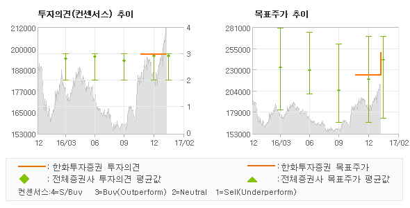 오늘 한화투자증권에서 발표된 '매수(유지)'의견 및 목표주가 250,000원은 전체의견에 수렴하면서 시장의 평균적인 기대감이 비교적 객관적으로 표현된 것으로 풀이되며 목표가평균 대비 4.1% 초과하고 있는 것으로 집계되었다. 참고로 최근에 목표주가를 가장 공격적으로 제시한 한국투자증권에서 투자의견 '매수(유지)'에 목표주가 270,000원을 제일 보수적인 의견을 제시한 SK증권에서 투자의견 '중립(유지)'에 목표주가 195,000원을 제시한 바 있다.