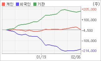 | 기관/개인 순매수, 외국인은 순매도(한달누적) 2월1일부터 전일까지 외국인이 4거래일 연속 순매수를 보였다. 4주간을 기준으로 보면 기관이 방향성있는 매매를 하면서 189,182주를 순매수했고, 개인들도 매기를 떨어뜨리면서도 3,351주를 순매수했다. 반면 그 동안 외국인은 매도 우위를 지속하면서 192,533주를 순매도했다. |