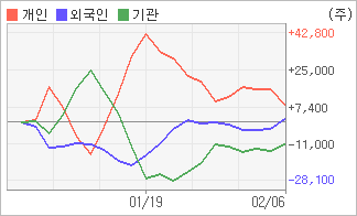 | 외국인/개인 순매수, 기관은 순매도(한달누적) 2월3일부터 전일까지 외국인이 2거래일 연속 순매수를 보였다. 4주간을 기준으로 보면 외국인이 매매관점을 매도에서 매수로 전환하면서 1,731주를 순매수했고, 개인들도 매기를 떨어뜨리면서도 8,812주를 순매수했다. 하지만 기관은 매도 우위를 보이면서 10,543주를 순매도했다. |