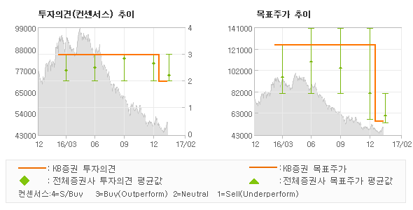 | ◆ Report statistics KB증권의 동종목에 대한 최근 1년동안의 투자의견은 전체적으로 조금 하향조정되고 있다. 목표주가는 2016년3월 125,000원까지 높아졌다가 2017년1월 55,000원을 최저점으로 목표가가 제시된 이후 최근에도 55,000원으로 제시되고 있다. |