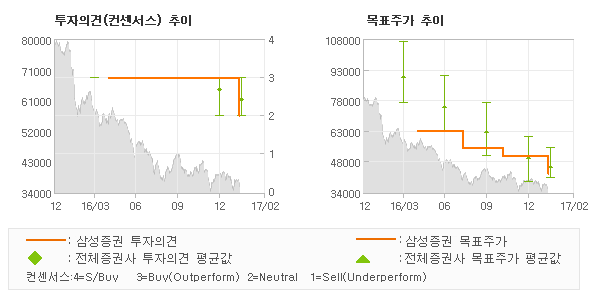 | ◆ Report statistics 삼성증권의 동종목에 대한 최근 6개월 동안의 투자의견은 전체적으로 조금 하향조정되고 있다. 목표주가는 2016년5월 63,000원까지 높아졌다가 2016년11월 51,000원을 최저점으로 목표가가 제시된 이후 최근에 42,000원으로 새롭게 조정되고 있다. |