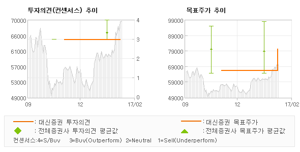 오늘 대신증권에서 발표된 '매수(유지)'의견 및 목표주가 80,000원은 전체 컨센서스 대비해서 대체적으로 평균치에 해당하는 수준으로, 이번 의견은 동종목에 대한 전체적인 흐름에서 크게 벗어나지 않은 것으로 파악되며 목표가평균 대비 5%정도 미달하고 있는 것으로 집계되었다. 참고로 최근에 목표주가를 가장 공격적으로 제시한 KTB투자증권에서 투자의견 'STRONG BUY'에 목표주가 98,000원을 제일 보수적인 의견을 제시한 IBK투자증권에서 투자의견 '매수(유지)'에 목표주가 64,000원을 제시한 바 있다.