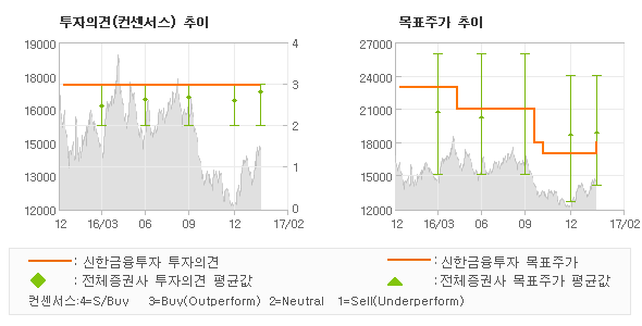 신한금융투자의 동종목에 대한 최근 1년동안의 투자의견은 전체적으로 큰 변화없이 유지되고 있다. 목표주가는 2016년2월 23,000원까지 높아졌다가 2016년11월 17,000원을 최저점으로 목표가가 제시된 이후 최근에 18,000원으로 새롭게 조정되고 있다.