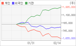 | 외국인과 개인은 순매도, 기관은 순매수(한달누적) 2월17일부터 전일까지 외국인이 2거래일 연속 순매수를 보였다. 4주간을 기준으로 보면 기관이 방향성있는 매매를 하면서 1,984,225주를 순매수한 반면, 외국인은 매도 우위를 지속하면서 329,353주를 순매도했고, 개인들도 매도쪽으로 방향을 잡으면서 1,654,872주를 순매도했다. |