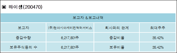 하이셈(200470)은 21일 최대주주 (주)팬아시아세미컨덕터서비스를 비롯한 특별관계자의 보유주식이 증가되었다고 발표했다. 이는 직전 보고일보다 6,217,801주 증가하여 지분율은 35.42%로 상승했다. 이번 보고 사유는 주식양수도계약(2014.02.14.)체결으로 알려졌다.