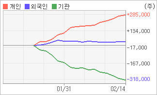 | 외국인/개인 순매수, 기관은 순매도(한달누적) 2월14일부터 전일까지 기관이 5거래일 연속 동종목을 내다 팔았다. 4주간을 기준으로 보면 외국인이 매수 우위를 유지하면서 33,445주를 순매수했고, 개인들도 순매수량을 늘리며 284,555주를 순매수했다. 하지만 기관은 매도 관점으로 접근하면서 318,000주를 순매도했다. |