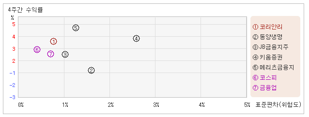| 관련종목들 가운데 위험도는 낮지만 성과는 좋아 21일 오후 2시5분 현재 전일대비 0.89% 상승한 11,300원으로 보합권에 머물러 있는 코리안리는 지난 1개월간 2.73% 상승했다. 동기간 동안 주가움직임의 위험지표인 표준편차는 0.7%를 기록했다. 이는 금융업 업종내에서 주요종목들과 비교해볼 때 코리안리의 월간 주가수익률은 적정한 수준에 있었지만 변동성은 가장 낮은 수준을 유지했다는 뜻이다. 최근 1개월을 기준으로 코리안리의 위험을 고려한 수익률은 3.9를 기록했는데, 가장 낮은 변동성을 보여주면서 위험대비 수익률은 가장 높은 수준을 유지했다. 뿐만아니라 금융업업종의 위험대비수익률인 1.2보다도 높기 때문에 업종대비 성과도 좋았다고 할 수 있다. 다음으로 업종과 시장을 비교해보면 코리안리가 속해 있는 금융업업종은 코스피지수보다 변동성은 높고, 수익률은 낮은 모습을 보여주고 있다. 다시 말해서 동업종은 지수보다 크게 오르락 내리락 했지만, 상승률은 오히려 지수보다 못하다는 의미이다. |