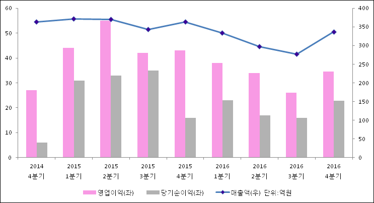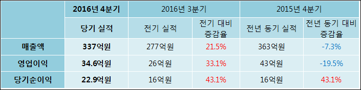 02월 21일 대원화성(024890)의 2016년 4분기 연결 잠정_대량변동 실적이 발표됐다. 작년 동기 대비해서는 매출액은 7.3% 하락하여 337억원으로 알려졌고, 영업이익 역시 34.6억원으로 19.5% 줄어들었다. 당기순이익은 43.1% 늘어난 22.9억원으로 집계되었다.