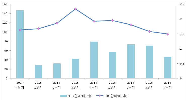 주가가 1주당 수익의 몇배가 되는지 나타내는 주가수익비율(PER)은 146.33배로 나타났다. 전년 동기 PER은 56.25배로 이번 분기에 상승했다.주가가 1주당 순자산의 몇배인지 알려주는 주가순자산비율인 PBR은 1.63배이다. PBR은 최근 3분기 이상 연속으로 하락하다가 이번 분기에 상승했다. 지난해 동기 PBR은 1.95배로 이번 4분기 PBR이 하락했다.