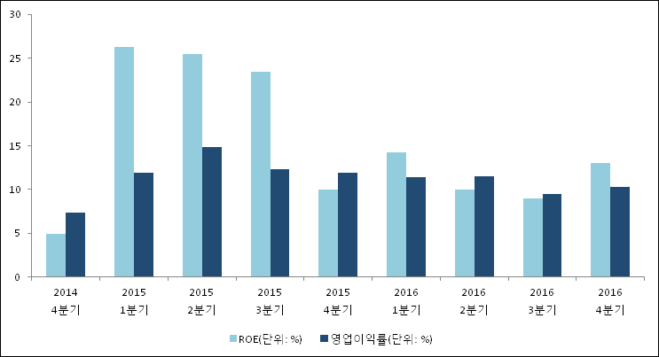 이번분기 기준으로 추정되는 대원화성의 자기자본이익률(ROE)은 4.9%로 나타났다. 전년 동기인 2015년 4분기 ROE는 14.2%로 이번 분기에 9.3%p 하락했다. 한편 동종목의영업이익률은 7.4%이다. 지난해 동기 영업이익률은 11.4%로 이번 4분기에 4%p 하락했다.
